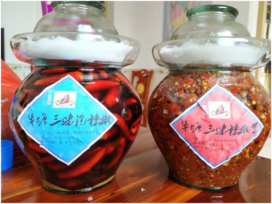 抱着试一试的态度何老汉种了1亩多地辣椒。但等到销售时他却犯愁了,陶岭镇四处都是辣椒,当时市场价每斤才8角钱,自己1亩地400多斤辣椒全卖出去也就300多元,还不包括施肥、人工等费用。就在何老汉失望之际,扶贫队长邓远超主动上门来“合伙”了。原来邓远超早就算计好了,生辣椒不好卖,那就制作辣椒酱。他和何老汉根据新田人口味特点制作了“泡辣椒”和“酱辣椒”两种坛装辣椒。其中泡辣椒用广东生抽和东安白醋腌制;“酱辣椒”又分两种,一种用茶籽油、豆豉、嫩姜和绿豆腌制,另一种用优质白酒和绿豆腌制。成品出来后,色泽鲜艳,香甜辣三味俱全,口感极佳,受到该县纪委监委干部的一致好评,第一次腌制的30坛酱辣椒以每坛50元的价格被帮扶干部一扫而空。