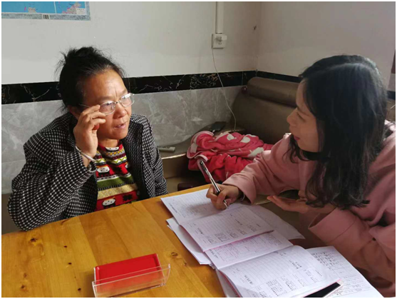 往东500米左右,我们来到邝中翠大婶家中。一见面,艳丽拉着邝中翠大婶不停地询问,时而用手比划,时而低头记录着。