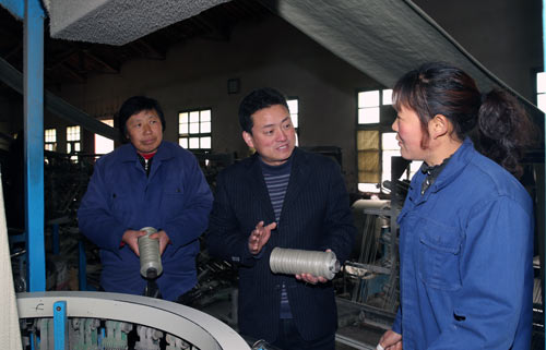 2013年12月,商州区大赵峪办事处书记赵新选(中)在冀村编织袋厂指导生产