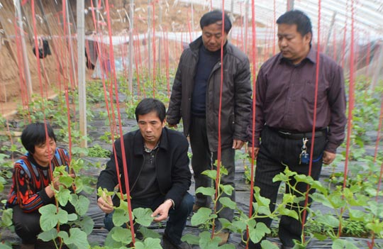 徐世芳(左二)到温室大棚了解甜瓜生长情况。