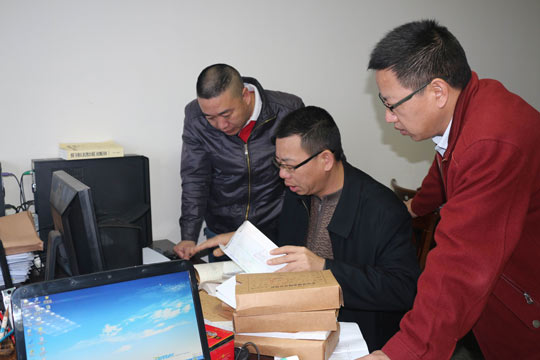 沈学东(中)与同事一起研究案情。黄喜祖 摄