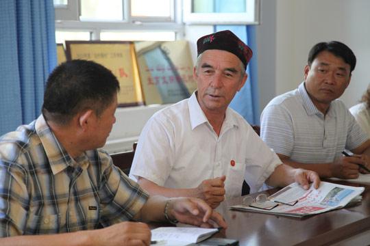 买买提江·吾买尔(中)和村干部、村民们一同商量村里的事 芦静 摄