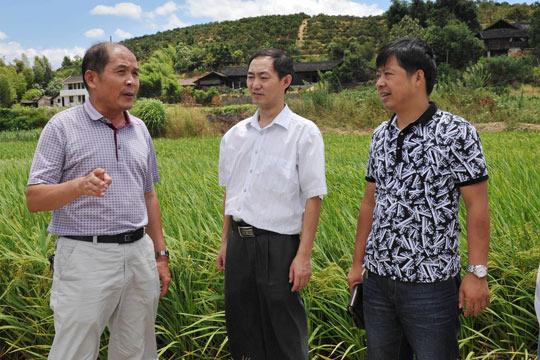 2013年8月,唐齐和(左一)在洪江市硖洲乡下坪村田间指导抗旱。(资料图片)