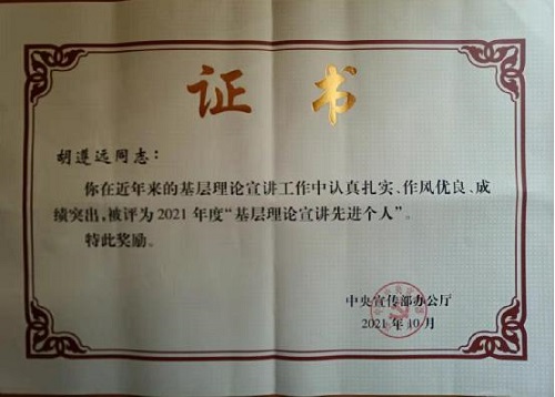 一是被中央宣传部评为2021年度“全国基层理论宣讲先进个人”(全国仅44人)。