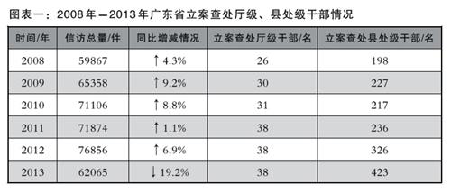 从案件总量看,违纪违法数量长期高位运行,尚未出现下降的拐点。近年来,广东省几乎每年都有一名省级干部被查处,近年先后有5名地级以上市市委书记或市长因腐败“落马”(深圳市原市长许宗衡、茂名市原市委书记罗荫国、汕头市原市委书记黄志光、中山市原市长李启红、揭阳市原市委书记陈弘平)。同时,在全国纪检监察机关信访举报数量整体呈下降趋势的情况下,广东省违纪违法案件多项指标仍呈上升趋势,违纪违法案件数量长期高位运行,还没有出现下降的拐点。(详见图表一)