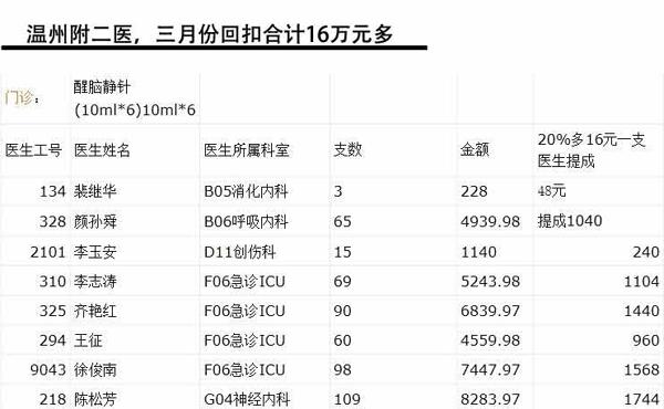 资料图:温州医学院附属第二医院3月份回扣清单(部分)