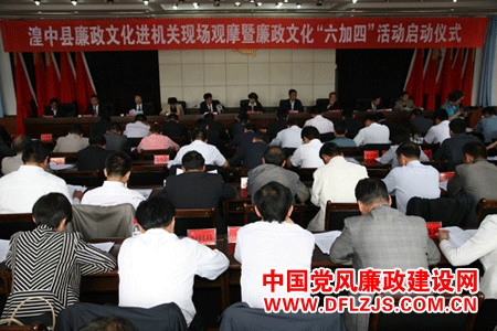 为进一步推动廉政文化建设,6月份,县委县政府和县纪委组织举办了廉政文化进机关现场观摩暨廉政文化“六加四”活动启动仪式。县各乡镇党委书记、镇长,湟中县常委、纪委书记、县直各机关的干部100多人现场观摩和交流了开展廉政文化建设工作的作法和经验。
