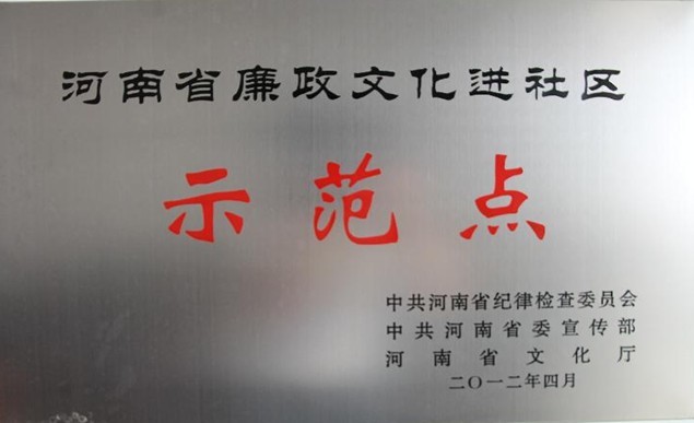 京广路街道佛岗社区被授予“河南省廉政文化进社区示范点”荣誉称号