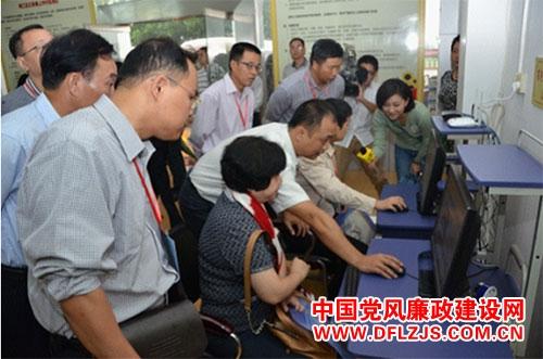 图为参会代表浏览考察梅州市梅江区三角镇上坪村农村党廉信息公开平台。