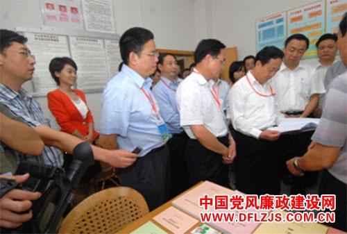 图为广东省市与会领导、代表在蕉岭县三圳镇芳心村参观考察村务监督工作。