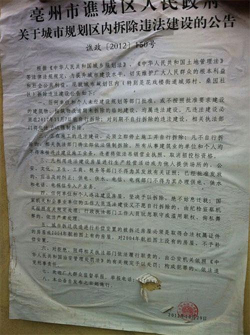 据了解,2012年10月29日亳州市谯城区人民政府发布“谯政[2012]150号关于城市规划区内拆除违法建设的公告”。