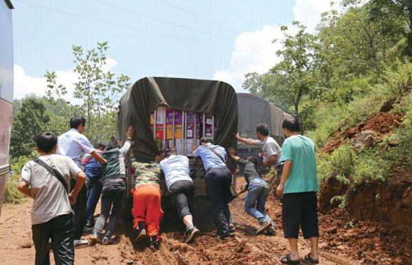 图为8月5日12时许,巧家县纪检监察干部在该县包谷垴乡新坪村花马垭口路段与群众一起帮助运送救灾物资的车辆通过泥泞路段。吴春雨 摄