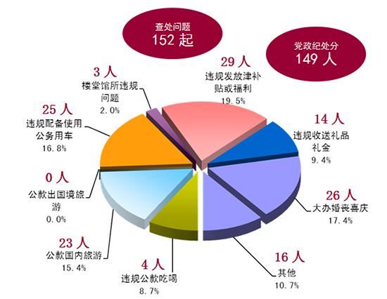 在查处的各类问题中,“违规配备使用公务用车”问题最为突出,处分31人,占处分人数的32.3%;居第二位的是“大办婚丧喜庆”问题,处分16人,占16.7%。4月因“违规发放津补贴或福利”处分12人,占12.5%。