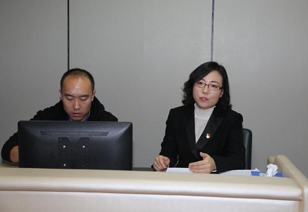 汪蕾(右)与同事在讯问被调查人(盛慧 摄)