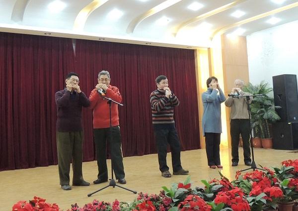 李勇携弟子郭基康等口琴合奏《解放军进行曲》。