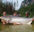 这不是传说:肯特先生(左)和他的朋友西恩吉尔汉姆(Sean Gillham),以及一位泰国钓鱼向导一起举起了这条体长达7英尺(2.1米),重...