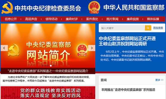 9月2日上午,中央纪委监察部网站正式开通。中共中央政治局常委、中央纪委书记王岐山,中共中央书记处书记、中央纪委副书记赵洪祝到网站调研。