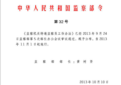 2013年10月10日,监察部公布《监察机关特邀监察员工作办法》(监察部令第32号,以下简称《工作办法》),对特邀监察员工作进行指导和规范。《工作办法》自2013年11月1日起施行。