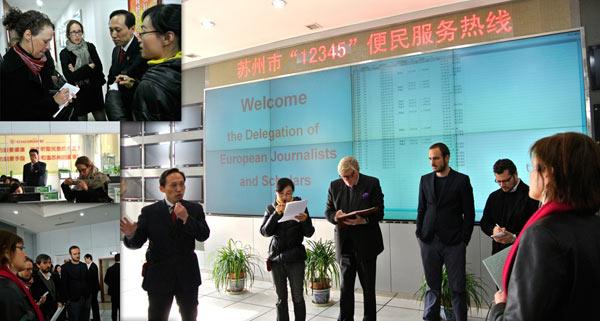 在苏州,考察团成员深入苏州市“12345”便民服务中心、姑苏区友新街道四季晶华社区采访考察,并与WTO上海研究中心副秘书长邱一川座谈了上海自贸区建设情况。“12345”热线和“寒山闻钟”论坛吸引了考察团成员的极大关注,他们有的亲自带上听筒听取电话记录,有的在翻译的帮助下与接线员采访交流,每位成员都是边走边听边记,还不时发问。“这个热线是免费的吗?穷人打得起吗?”“平均每天能接到多少电话?”“热线接到的投诉都有哪些类型,有没有人通过热线反映腐败问题?”“论坛和热线收到的民众意见会上报给政府吗?”苏州市人民政府便民服务中心主任周旭东和苏州市纪委效能监察室主任薛啸逐一作答。周旭东胸前佩戴的党徽还引起了考察团成员的关注,多位记者请求收藏一枚党徽留作纪念。