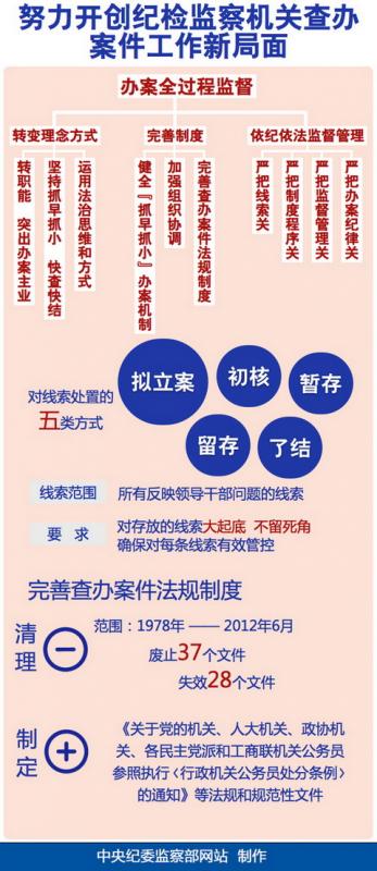 对线索处置,中央纪委研究制定了拟立案、初核、暂存、留存和了结五类处置方式和标准,完善和细化侧面了解、初核、立案、采取党内审查措施、涉案款物管理等各项制度。