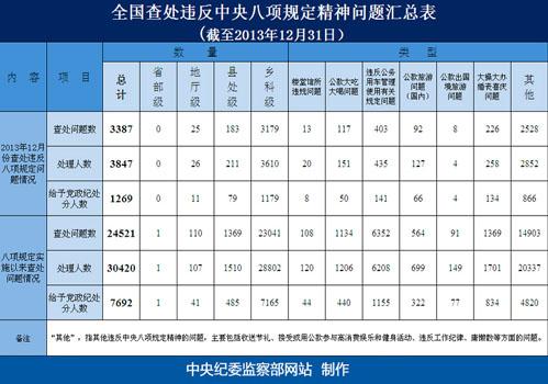 为掌握全国贯彻落实八项规定精神情况,中央纪委在31个省区市和新疆生产建设兵团、60个中央和国家机关建立了落实中央八项规定精神情况月报制度。截至2013年12月31日,全国查处违反中央八项规定精神问题情况如下: