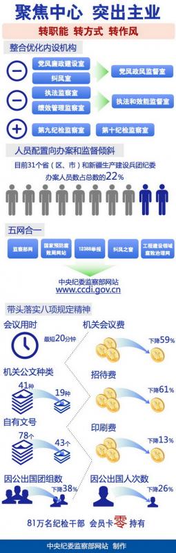 为进一步将主要精力集中到党风廉政建设和反腐败工作上,中央纪委监察部对内设机构进行整合优化。委部机关撤销党风廉政建设室、纠正部门和行业不正之风室,新设立党风政风监督室(国务院纠正行业不正之风办公室),撤销执法监察室、绩效管理监察室,新设立执法和效能监督室,增设第九纪检监察室和第十纪检监察室。通过调整,减少了机构重叠和职能交叉,机构设置、人员配置进一步向办案和监督工作倾斜。各地纪委也纷纷启动内设机构调整工作,目前,31个省(区、市)和新疆生产建设兵团纪委办案人员数占总数的22%。