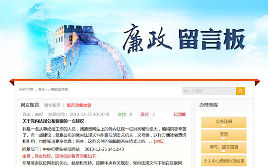 为更好地了解民情、听取民声民意,主动搭建纪检监察机关与网民直接沟通交流的平台,中央纪委监察部网站专门开设“廉政留言板”专栏。留言板开通五个多月以来,收到网友提出的大量关于党风廉政建设和反腐败工作的意见建议和问题咨询等,中央纪委有关职能部门及时办理、回复网友留言,释疑解惑、排忧解难,受到广大网友好评。