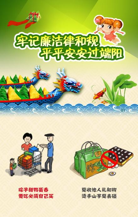 “棕子甜,鸭蛋香,要吃必须自己买;插艾草,佩香囊,防虫祛邪保清洁;喝雄黄,划龙舟,阖家欢乐过端阳。端午将至,清风真诚提醒:反对‘四风’是常态,廉政规定要牢记,公款礼物不能收,若存侥幸触党纪,严厉处罚并曝光,别怪清风没提醒哦。”
