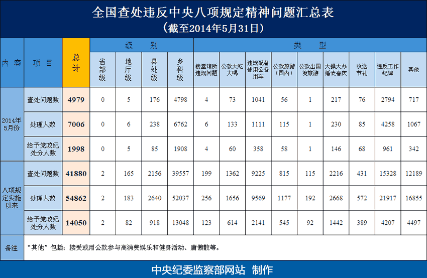 为掌握全国贯彻落实中央八项规定精神情况,中央纪委在31个省(区、市)和新疆生产建设兵团、59个中央和国家机关建立了落实中央八项规定精神情况月报制度。截至2014年5月31日,全国查处违反中央八项规定精神问题情况如下: