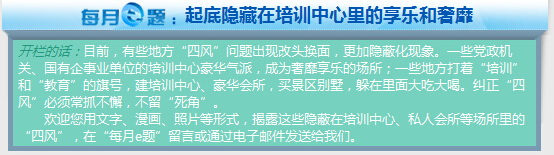 本网同步开设7月“每月e题”:起底隐蔽在培训中心里的享乐和奢靡。欢迎您用文字、漫画、照片等形式,揭露这些隐蔽在培训中心、私人会所等场所里的“四风”,在“每月e题”留言或通过电子邮件发送给我们。