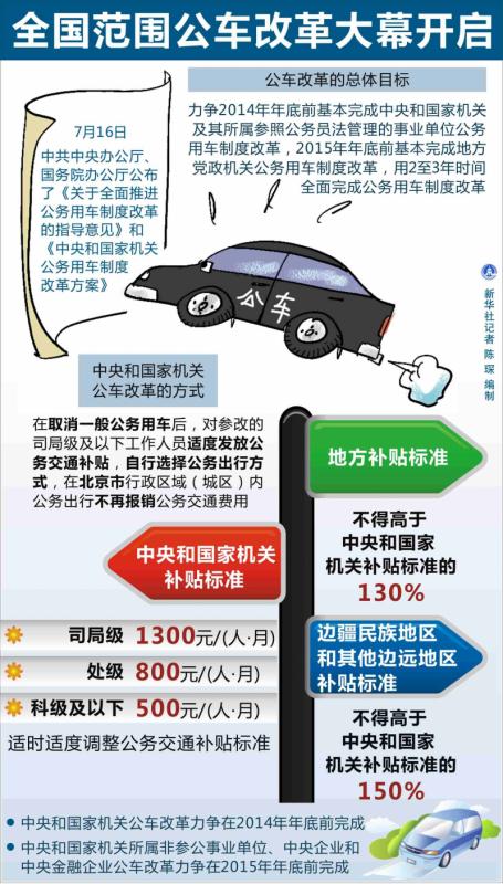 按照方案,中央和国家机关公车改革力争在2014年年底前完成,中央和国家机关所属非参公事业单位、中央企业和中央金融企业公车改革力争在2015年年底前完成。(记者 赵超 陈炜伟)