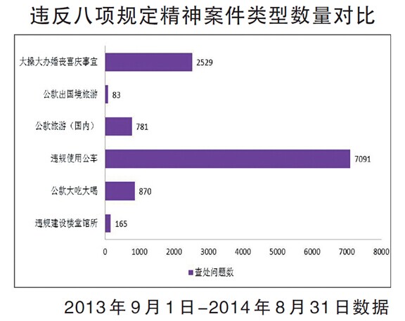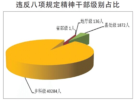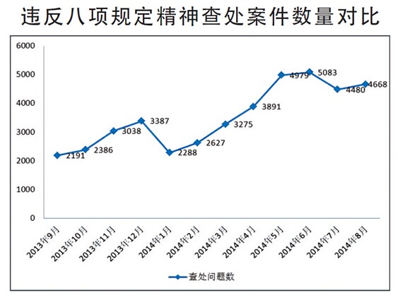 背景分析:2013年9月起,中央纪委监察部实行全国查处违反中央八项规定精神问题每月通报制度。据统计,一年来,案件数量呈现逐步上升的态势。这一方面反映出各地各部门对违反中央八项规定精神问题的常抓不懈、查处力度不断加大;另一方面,也说明少数党员领导干部无视规定、顶风违纪的现象依然存在。在查处的案件中,乡科级干部比例达95%,成为违规的主体,而县处级、地厅级、省部级人数依次减少。同时,违规使用公车、大操大办婚丧喜庆事宜、公款大吃大喝等问题较为突出。