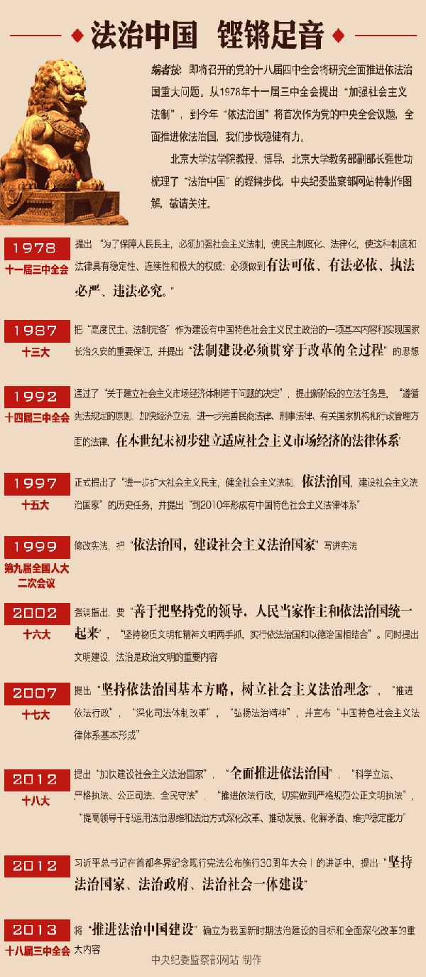 北京大学法学院教授、博导,北京大学教务部副部长强世功梳理了“法治中国”的铿锵步伐,中央纪委监察部网站特制作图解,敬请关注。
