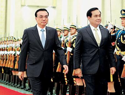 李克强表示,3天前,我们在曼谷共同见证签署了中泰铁路和农产品贸易合作的两个文件,标志着两国铁路合作取得重大进展,也表明中泰合作的深度和广度有了新突破。中方愿同泰方一道,尽快启动商谈合作模式等具体问题,抓紧做好前期准备,争取铁路早日开工建设,让双方及沿线人民及早受益。