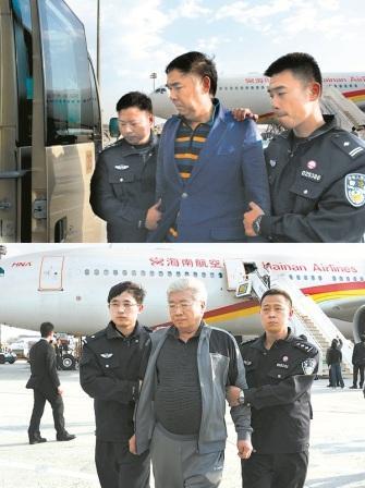 3月28日,天津市国税局直属分局原局长庞顺喜(上中)、天津港保税区瀚通国际贸易有限公司原总经理安惠民(下中)被押解回国。
