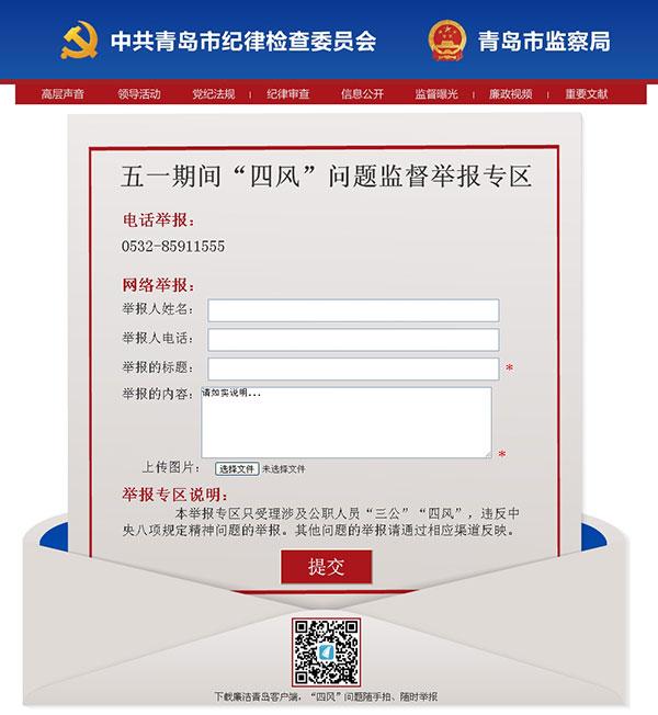4月17日,青岛市纪委监察局网站推出“五一期间‘四风’问题监督举报专区”,专区开设了“网络举报”窗口和“电话举报”热线,欢迎广大网友对身边公款吃喝、旅游、送节礼等不正之风进行监督举报。