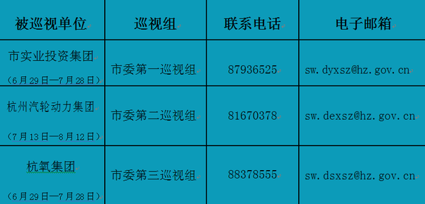 近日,根据杭州市委统一部署,杭州市今年第三轮巡视对市实业投资集团、杭州汽轮动力集团和杭氧集团等3家国企开展巡视,时间从6月29日开始到8月12日结束。
