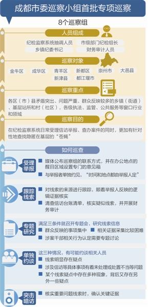 7月底开始,成都市委巡察工作领导小组派出8个巡察组,开展首批专项巡察,以切实解决发生在群众身边的“四风”和腐败问题。首批巡察的对象是金牛区、成华区、青羊区、新都区、崇州市、大邑县、新津县和都江堰市8个区(市)县。