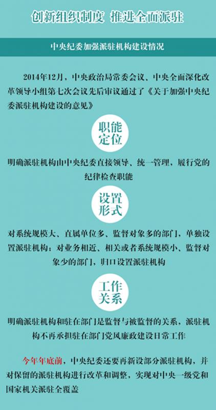 根据十八届三中全会的部署,2014年12月,中央出台《关于加强中央纪委派驻机构建设的意见》,对派驻机构的职能定位、设置形式、工作关系等进行了改革创新。同时,中央还决定,在中央办公厅等对党和国家政治生活具有重要影响的7家中央和国家机关新设中央纪委派驻机构,归口监督50多个部门和单位。目前,7家新设派驻纪检组已经顺利组建并开始发挥重要监督作用。