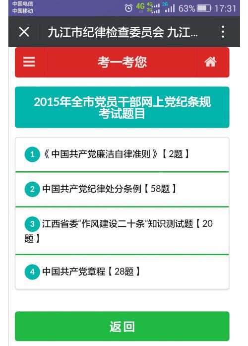 “党纪条规考试考了吗?多少分?”这是近几天江西省九江市各市直单位党员干部常说的问候语。从10月16日起,九江市直单位5000余名党员干部通过手机微信参加全市党纪条规网上学习考试。