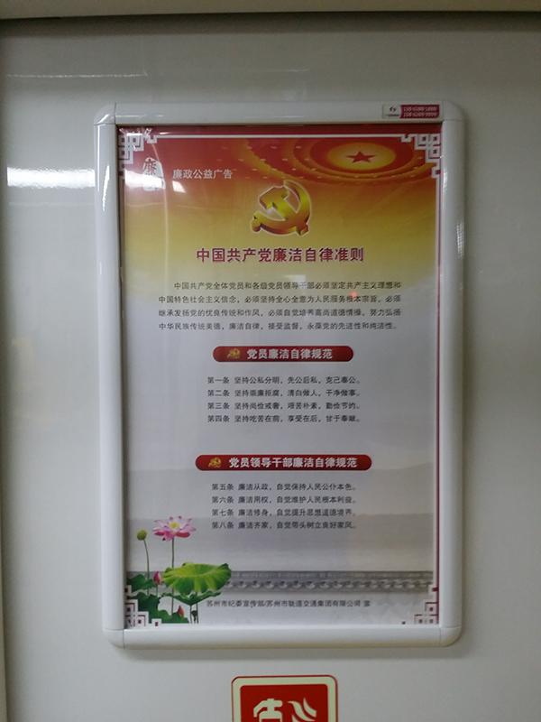 为在全市营造学习宣传新修订的《中国共产党廉洁自律准则》和《中国共产党纪律处分条例》的浓厚氛围,首次开通的“廉洁文化”专列就以新的《廉洁自律准则》为主题,在整列车厢内设置了50块以宣传党员廉洁自律规范和党员领导干部廉洁自律规范为主要内容的海报。另外,苏州轨交集团还在轨道交通1、2号线桐泾北路站、西环路站等8个车站站厅内布置了“廉洁文化”海报。