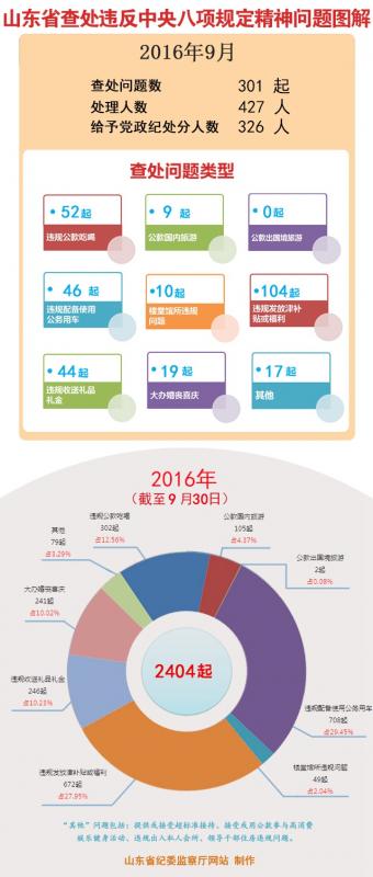 2016年前三季度,山东省各级纪检监察机关查处违反中央八项规定精神问题2404起,处理3565人,党纪政纪处分2490人。