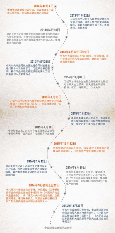2016年11月29日,甘肃省纪委通报4起违反中央八项规定精神问题;11月28日上海市通报5起违反中央八项规定精神问题;9月28日,国务院国资委通报6起违反中央八项规定精神问题;9月27日,中央纪委通报6起违反中央八项规定精神问题……