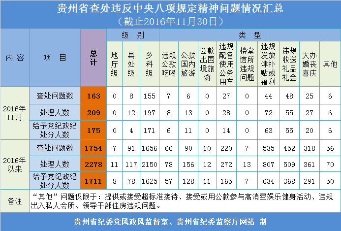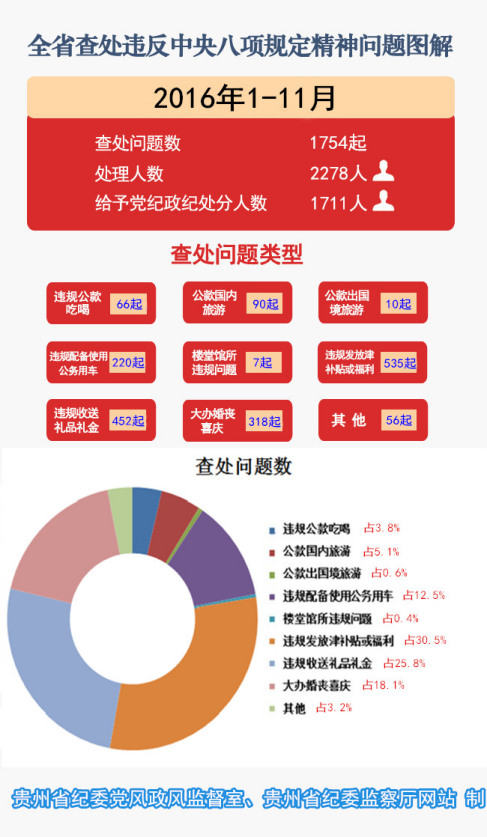 2016年1至11月,贵州省共查处违反中央八项规定精神问题1754起,处理2278人,处分1711人。