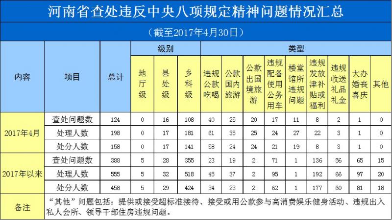 2017年4月,河南省各级纪检监察机关共查处违反中央八项规定精神问题124起,处理198人,处分158人。今年1至4月,全省各级纪检监察机关共查处违反中央八项规定精神问题388起,处理555人,处分458人。