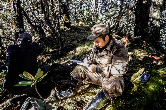 巡护队员记录红外线触发相机数据