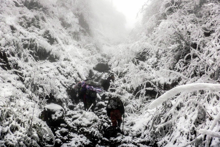 从海拔1000多米左右的保护区界口到海拔5364米的成都第一峰苗基岭,巡护队员还面临着高寒和缺氧的挑战。重达四五十斤的行囊时刻考验着巡护队员的体力。遇上大雾、冰雪等恶劣天气,大家不得不走几步便停下休息,一方面积蓄体力,一方面方便“报数”,从队伍头一人一直喊到最后一人,防止有人途中掉队。