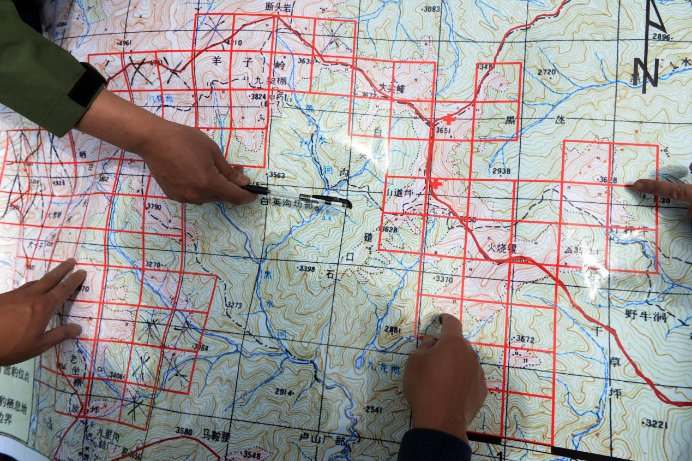地图上的一个红色方格就是一个监测区域,每一次巡护,巡护队至少要踏及地图中20个红色小方格,打击破坏野生动物栖息环境和偷猎、盗猎等违法行为,同时收集、记录野生动植物踪迹。