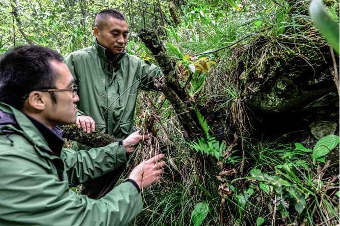 巡护队员在隐秘处安装红外线触发相机