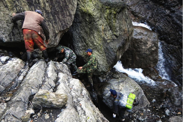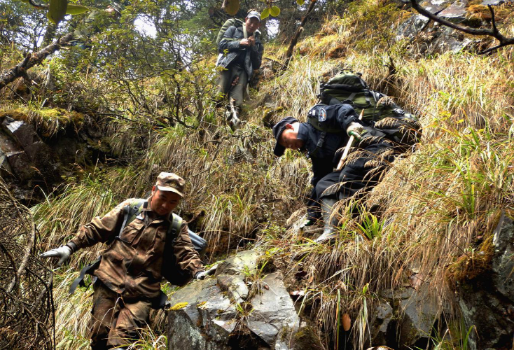在这样的环境里,巡护队员平均每天要行走8至12小时。峭壁险路迂回曲折使得行程拉得格外长,平地上1小时的路程,在山间花上一整天也不稀奇。最夸张的一次,从九里岗到九龙池仅7000米的直线距离,巡护队员整整走了11个小时,最终路程超过30公里。